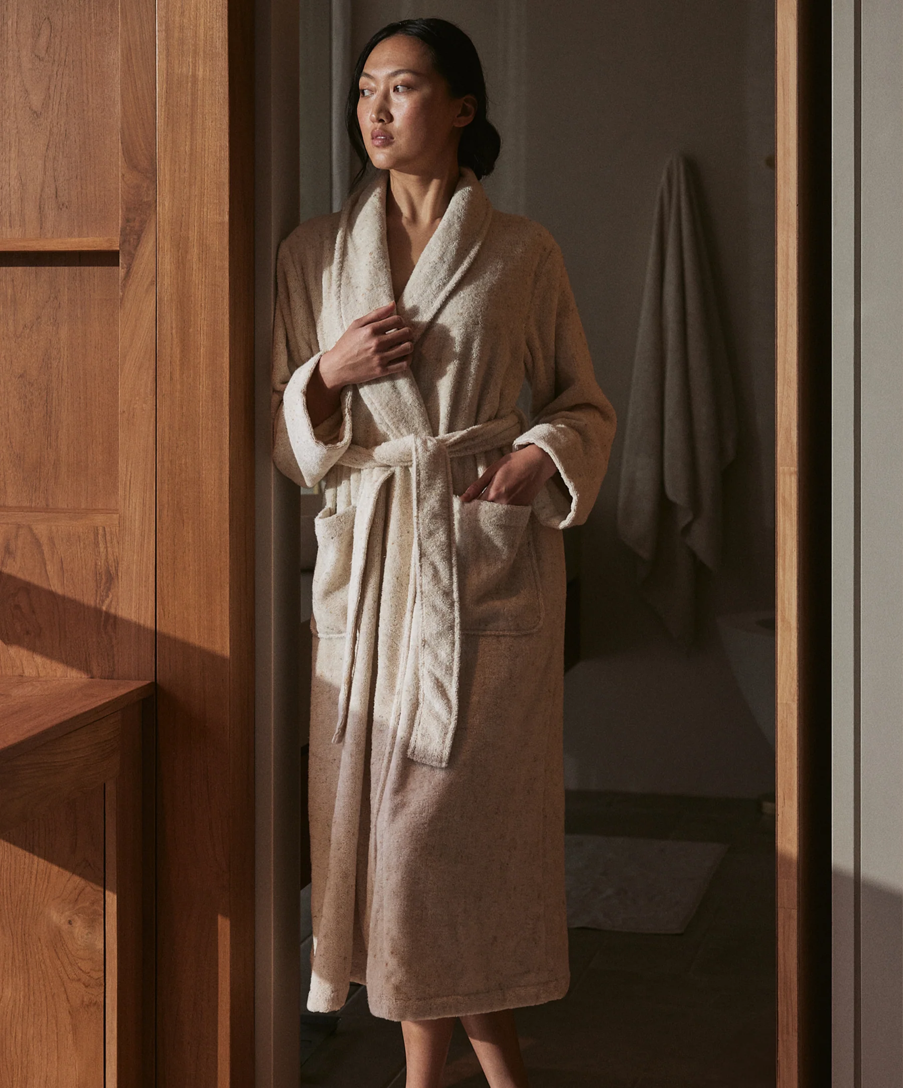 Echoing the signature softness of our Speckle Towel Collection, the Speckle Robe is woven in Turkey from 380 GSM organic cotton terry – a slightly lighter, more fluid-weight fabric than our towels, designed to drape effortlessly over the body for an indulgent sense of comfort. The lightweight yet plush fabric has subtle flecks of color woven throughout, creating beautiful depth and interest.